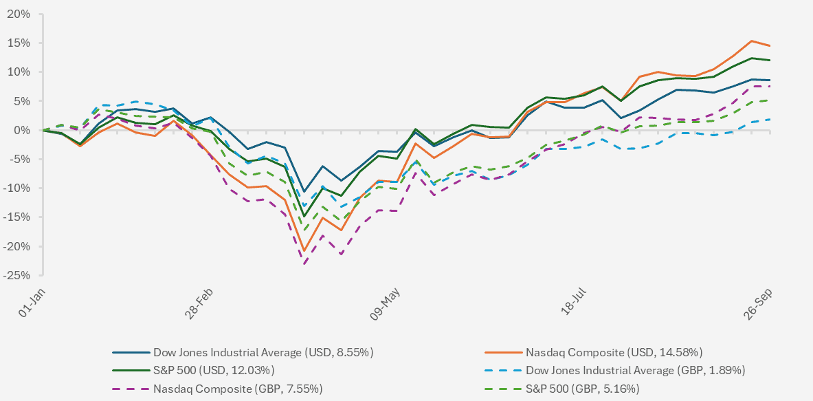 Chart showing YTD returns of major US equity indices (Source – Watson French with data from FE Analytics. Solid lines shows the returns in US Dollars. Dashed lines show the returns in GBP. Data based on weekly returns. Data correct as at 29.09.2025).