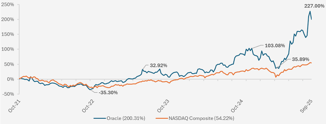 Chart showing the five year cumulative performance of Oracle Corporation and the NASDAQ Composite Index (Source – Watson French with data from Investing.com. Returns are in US Dollars and based on weekly data. Data callouts show the cumulative return of Oracle at various dates. Data correct as at 29.09.2025).