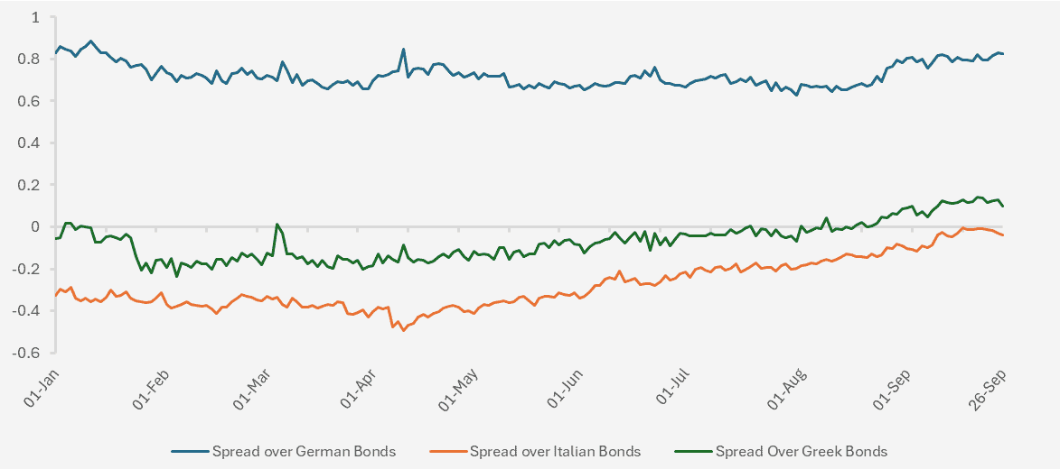 Chart showing 10 Year French government bond yields relative to 10 year German, Italian and Greek government bond yields. (Data correct as at 26.09.2025. Source – Watson French with data from Investing.com).