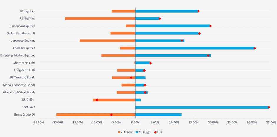 Selection of assets 2025 YTD returns and range of returns as at 30/09/2025 (the two ends of the bars represent the range of YTD returns and the red dots represent the current YTD return). Indexes used: FTSE All-Share, Russell 2000, STOXX Europe 600, MSCI World ex USA, MSCI Japan, MSCI China, MSCI Emerging Markets, FTSE UK Conventional Up To 5 Years, FTSE UK Conventional Over 15 Years, ICE BOFA US Treasury, ICE BOFA Global Corporate, ICE BOFA Global High Yield, US Dollar Index, S&P GSCI Gold Spot & S&P GSCI Brent Crude Spot. Returns hedged back to GBP with exception of US Dollar which is in US Dollar terms. Returns based on daily returns. Source – Watson French with data from FE Analytics and MarketWatch.
