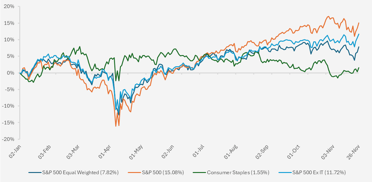 Chart showing YTD performance of various US equity indices and sub-indices (Source – Watson French with data from Financial Times/LSEG. Returns in USD. Data based on daily opening prices. Data correct as at 26.11.2025).
