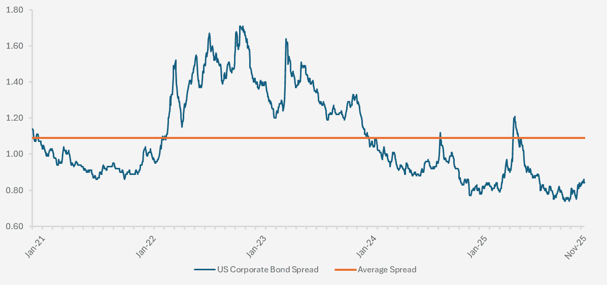 Chart showing ICE BofA US Corporate Index Option-Adjusted Spread over a five year period from 26/11/2020 – 25/11/2025. (Source – Watson French with data from St Louis Fred & ICE BOFA Indices. Data based on daily data points. Data correct as at 26.11.2025. The blue line shows the difference between the yield on US investment grade corporate bonds and a spot treasury curve. The orange line shows the historical average over the five year period. The lower the line the tighter the spread the less compensation a bond hold receives for the credit risk involved in investing in corporate bonds. Put another way the lower the line the more expensive corporate bonds are).