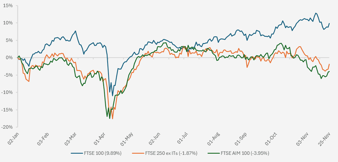 Chart showing YTD performance of various UK equity indices (Source – Watson French with data from Financial Times/LSEG. Returns in GBP. Data based on daily opening prices. Data correct as at 26.11.2025).