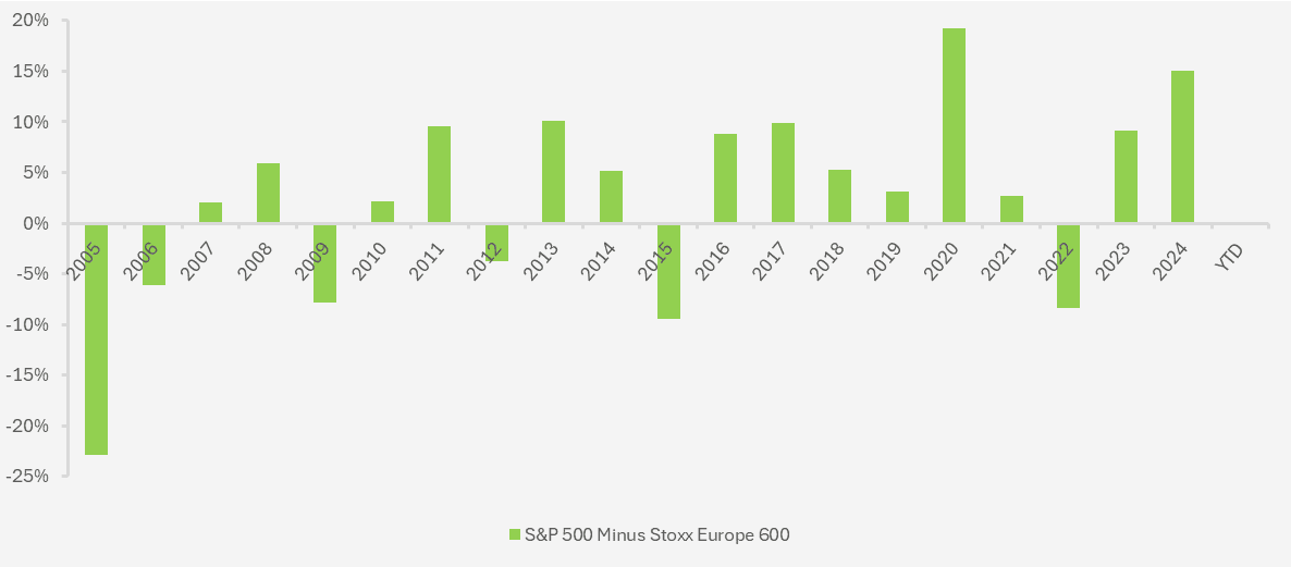 Chart showing the difference in annual calendar year performance between the S&P 500 and the Stoxx Europe 600 Index. (Source – Watson French with data from FE Analytics. Data based on local currency returns of indices. Data correct as of 27.11.2025).