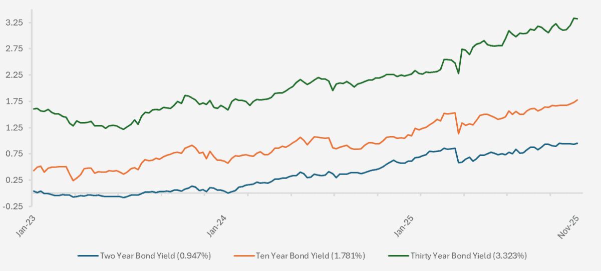 Chart showing the Japanese government bond yields over a period from 01.01.2023 to 25.11.2025 (Source Watson French with data from Investing.com. Yields based on weekly opening yields. Data correct as of 27.11.2025).