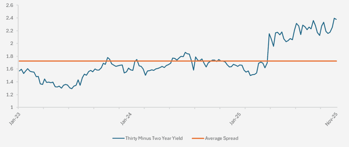 Chart showing the yield spread between the thirty year and two year Japanese government bond yields from 01.01.2023 to 25.11.2025. (Source Watson French with data from Investing.com. Yields based on weekly opening yields. The blue line shows the difference in yield between the two maturities. As the line rises the spread is greater i.e. the thirty year bond yield is rising at a faster pace than the two year bond yield. Orange line shows the historical average spread over the period. Data correct as of 27.11.2025).