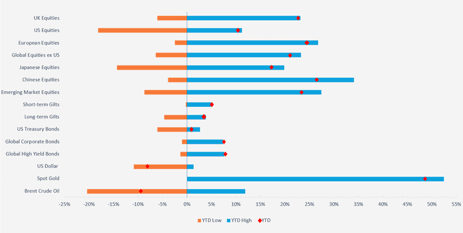 Selection of assets 2025 YTD returns and range of returns as at 27.11.2025 (the two ends of the bars represent the range of YTD returns and the red dots represent the current YTD return). Indexes used: FTSE All-Share, Russell 2000, STOXX Europe 600, MSCI World ex USA, MSCI Japan, MSCI China, MSCI Emerging Markets, FTSE UK Conventional Up To 5 Years, FTSE UK Conventional Over 15 Years, ICE BOFA US Treasury, ICE BOFA Global Corporate Hedged GBP, ICE BOFA Global High Yield Hedged GBP, US Dollar Index, S&P GSCI Gold Spot & S&P GSCI Brent Crude Spot. Returns hedged back to GBP with exception of US Dollar which is in US Dollar terms. Returns based on daily data. Source – Watson French with data from FE Analytics and MarketWatch. Data correct as at 27.11.2025.