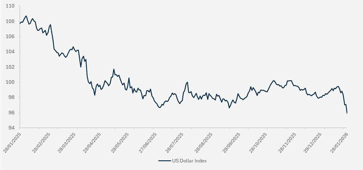 Chart showing US Dollar Index over a one-year period. The US Dollar Index measure the US Dollar against six major currencies. (Source – Watson French with data from Investing.com. When the blue line falls this shows a weakening in the US Dollar. Data period 28.01.2025 – 28.01.2026. Yield based on daily opening rates. Data correct as of 28.01.2026).
