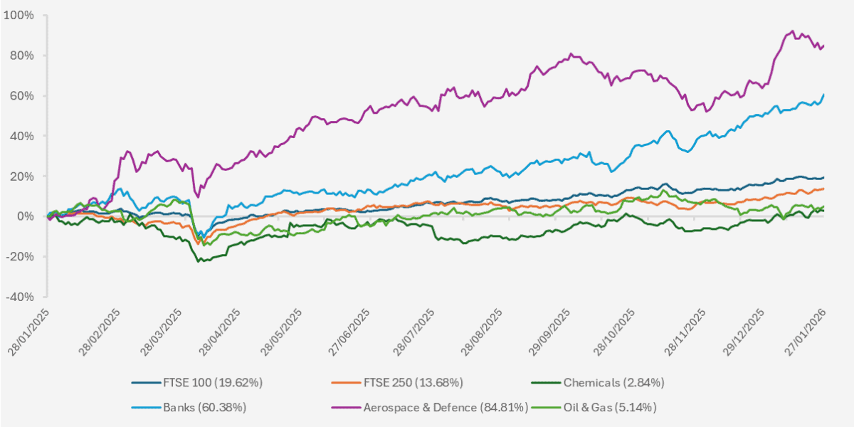 Chart showing performance of the FTSE 100, FTSE 250 indices and various FTSE All Share sub-sectors over a one-year period. (Source – Watson French with data from Investing.com. Returns in Pounds Sterling. Data period between 28.01.2025 – 27.01.2026. Data correct as at 28.01.2026).