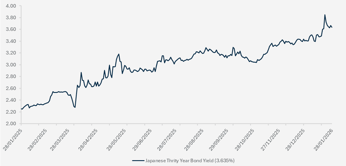 Chart showing movement in the Japanese Thirty Year Government Bond yield over a one-year period. (Source – Watson French with data from Investing.com. Yield in brackets is opening yield at 28.01.2026. Data period 28.01.2025 – 28.01.2026. Yield based on daily opening yields. Data correct as of 28.01.2026).