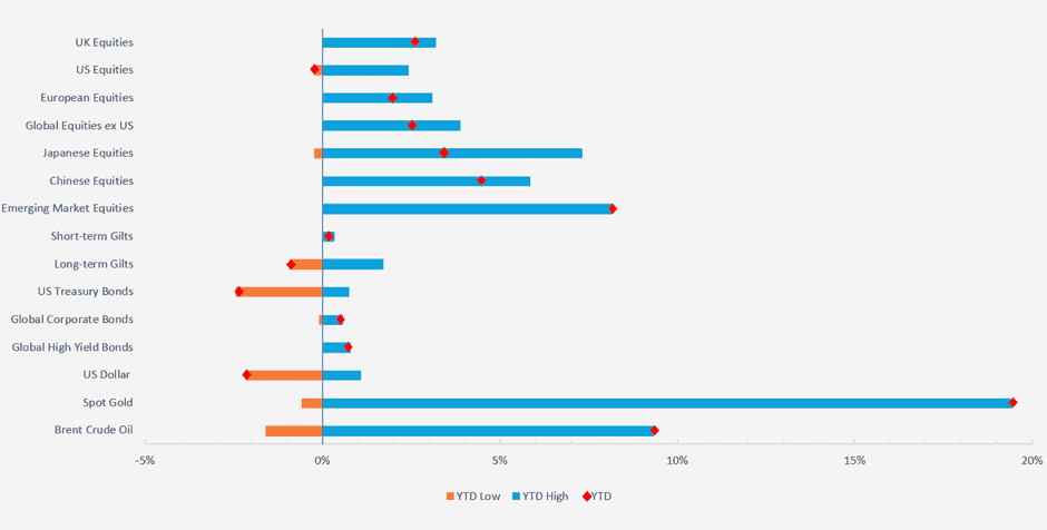 Selection of assets 2026 YTD returns and range of returns as at 28.01.2026 (the two ends of the bars represent the range of YTD returns and the red dots represent the current YTD return). Indexes used: FTSE All-Share, Russell 2000, STOXX Europe 600, MSCI World ex USA, MSCI Japan, MSCI China, MSCI Emerging Markets, FTSE UK Conventional Up To 5 Years, FTSE UK Conventional Over 15 Years, ICE BOFA US Treasury, ICE BOFA Global Corporate Hedged GBP, ICE BOFA Global High Yield Hedged GBP, US Dollar Index, S&P GSCI Gold Spot & S&P GSCI Brent Crude Spot. Returns hedged back to GBP with exception of US Dollar which is in US Dollar terms. Returns based on daily data. Source – Watson French with data from FE Analytics and MarketWatch. Data correct as at 28.01.2026.